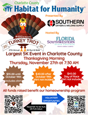 Come join Charlotte County Habitat for Humanity's Annual Turkey Trot 5K Run/Walk on Thanksgiving morning. This family-friendly 5K event is located on the scenic campus of FSW College, Punta Gorda Campus. This event has been a beloved tradition for friends, family, and fitness enthusiasts for over 27 years - and the only race where you can chase a Bicycle Riding Turkey! Join us as we wobble before we gobble!