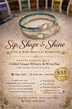 Join us for Sip, Shape & Shine, a fun and creative Wine & Wire Bracelet Workshop at Gilded Grape Winery & Wine Bar! Enjoy a relaxing evening crafting your own custom-fit bracelet with instructor guidance, all materials included, and a glass of wine or beverage of your choice. Perfect for a night out with friends—limited spots available! RSVP 941-419-1194